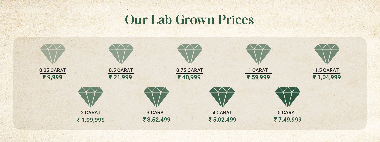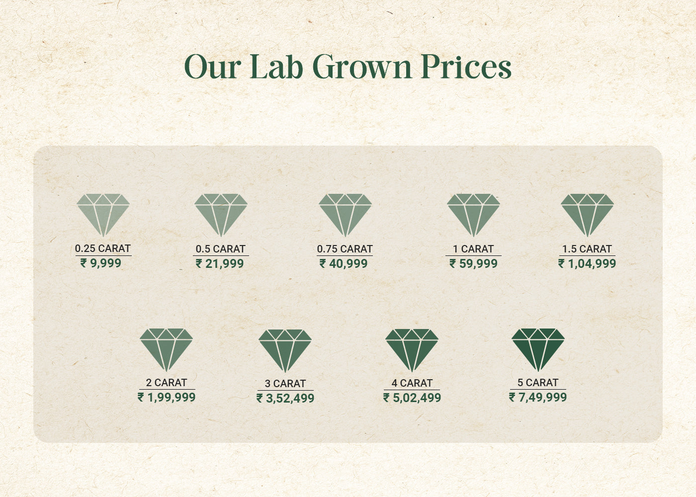 At crash.club, we believe in transparent and fair pricing for extraordinary beauty. Our Lab Grown Diamonds start at an attractive price of Rs. 9,999*. Why this pricing? Each diamond is cultivated to perfection, meeting our stringent standards for cut, clarity, and colour. As the carat size increases, so does the value, reflecting the care that goes into each stone.