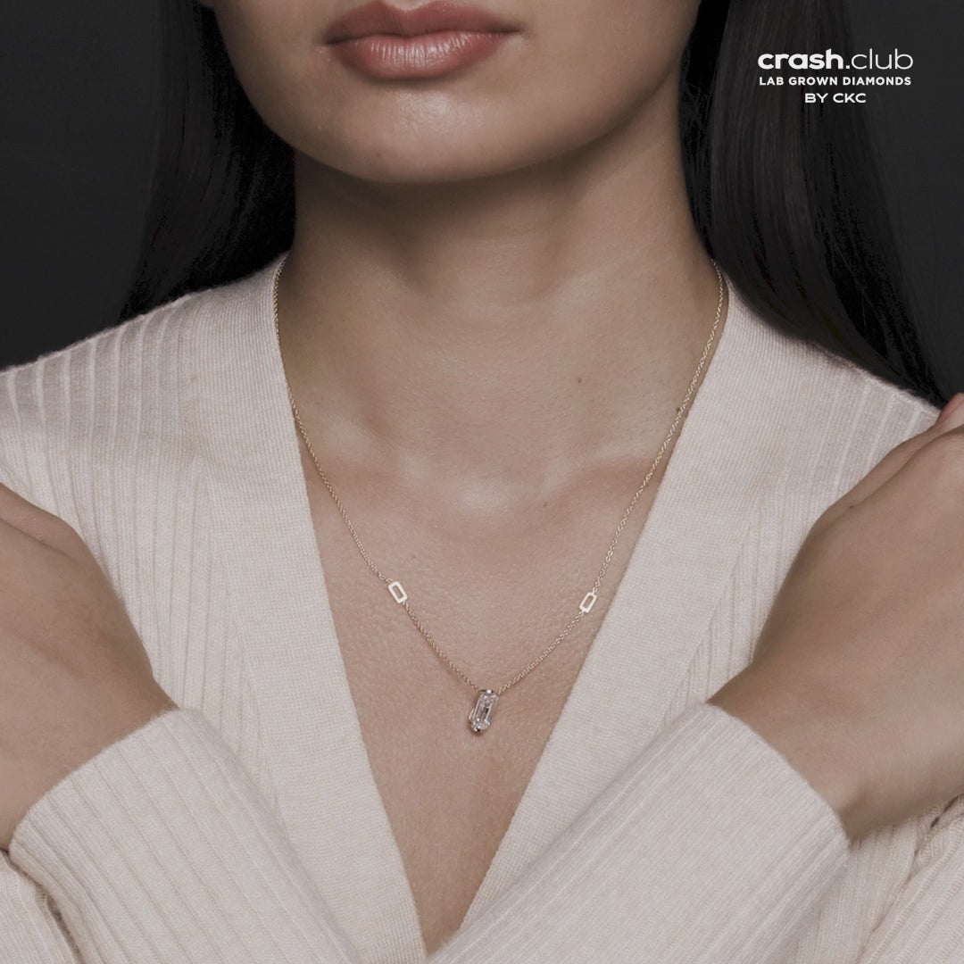 Effortlessly modern with a touch of architectural grace, this gold pendant features a vertically-set elongated cushion-cut lab-grown diamond. Its sleek silhouette is suspended between minimal open gold links, striking the perfect balance between strength and elegance. A refined essential for the contemporary collector.