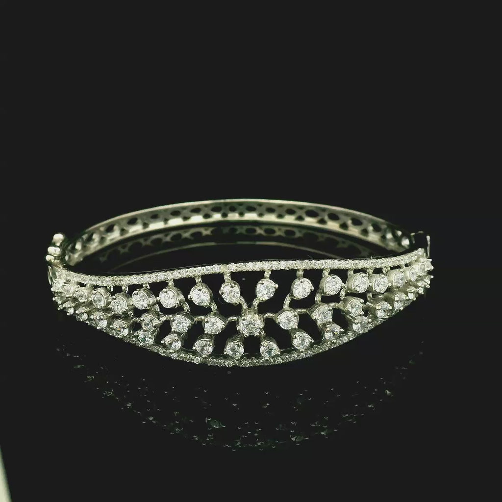 This exquisite sterling silver bangle showcases an intricate floral filigree design adorned with sparkling cubic zirconia stones. The delicate openwork pattern creates a graceful blend of elegance and craftsmanship. Perfect for elevating both traditional and contemporary looks, this bangle offers timeless sophistication.