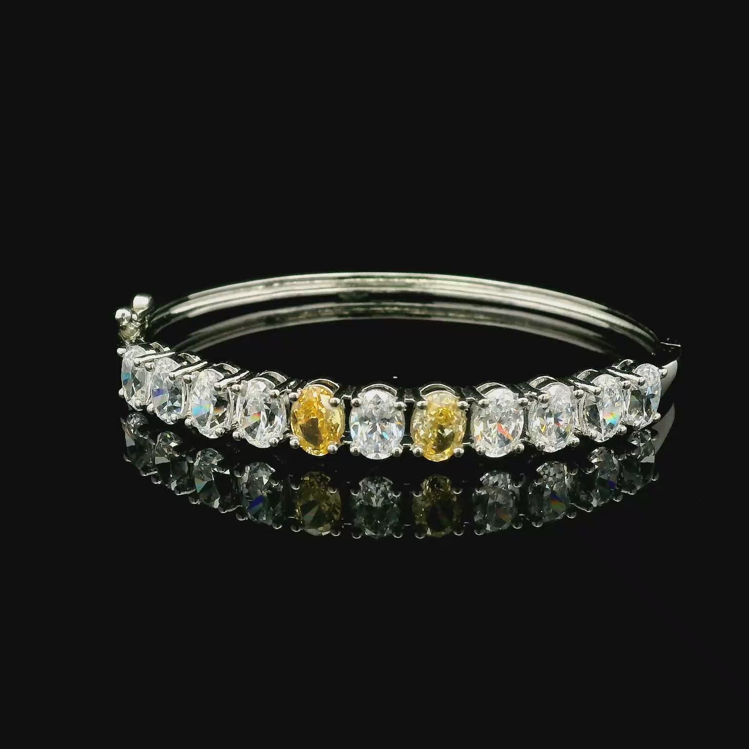 The Sterling Silver Oval Gemstone Bracelet Collection is a radiant showcase of color and brilliance. Each bracelet features a duo of vivid oval-cut gemstones—available in shades of serene blue, golden yellow, or warm orange—framed by sparkling white stones in a continuous band. Crafted with timeless elegance and modern flair, these designs offer a versatile statement of grace for every occasion.