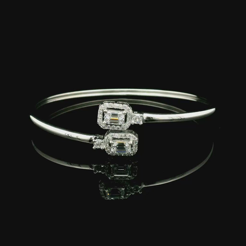 This sterling silver bracelet is a refined expression of elegance, featuring twin emerald-cut stones embraced by shimmering halos of brilliance. The open-ended design highlights the stones as luminous focal points, each symbolizing timeless sophistication and modern charm.
