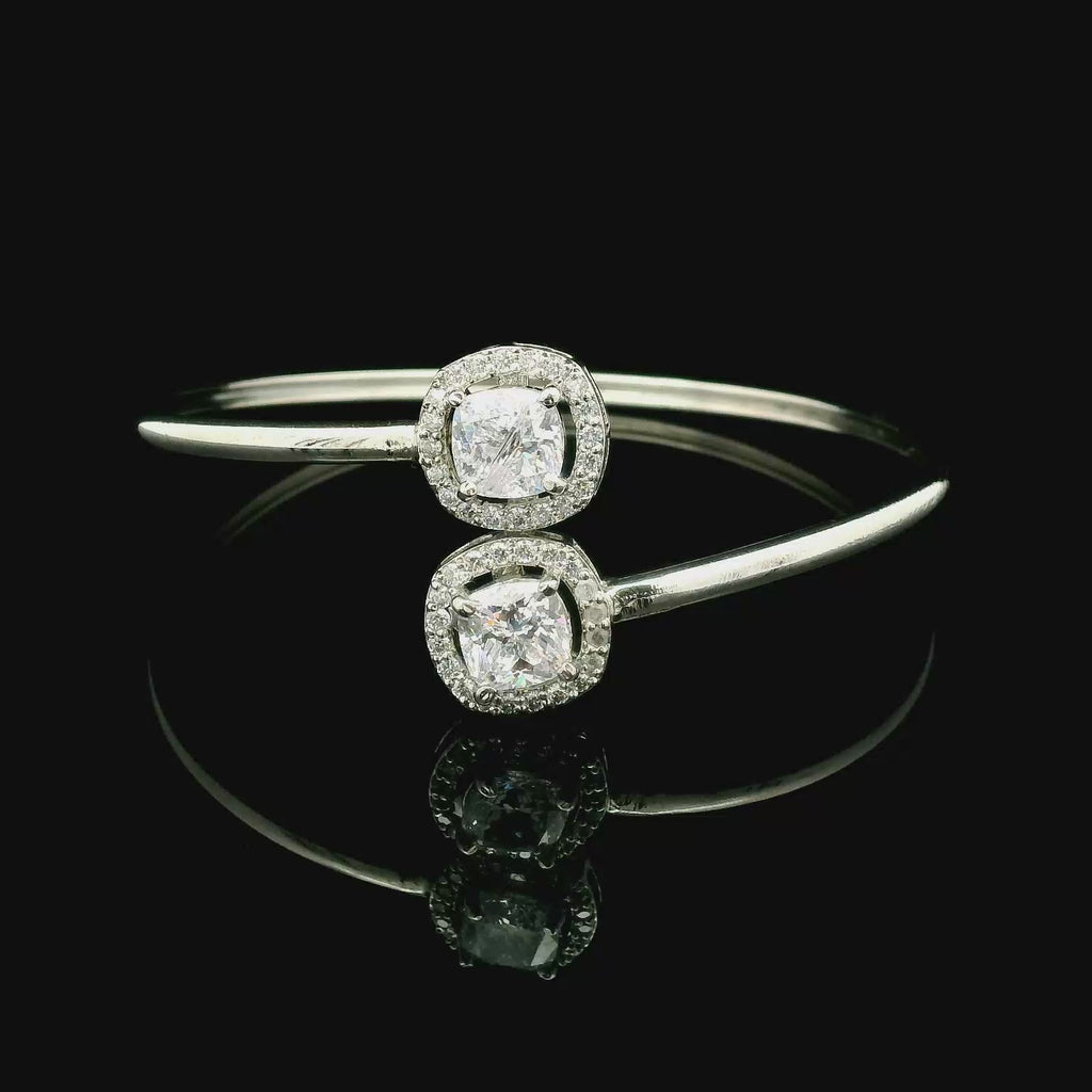 A captivating blend of brilliance and elegance, this sterling silver bracelet features two radiant cushion-cut stones as its centerpiece, each surrounded by a delicate halo of sparkling accents. The open-ended design adds a contemporary flair, allowing the stones to take center stage while offering comfort and grace on the wrist.
