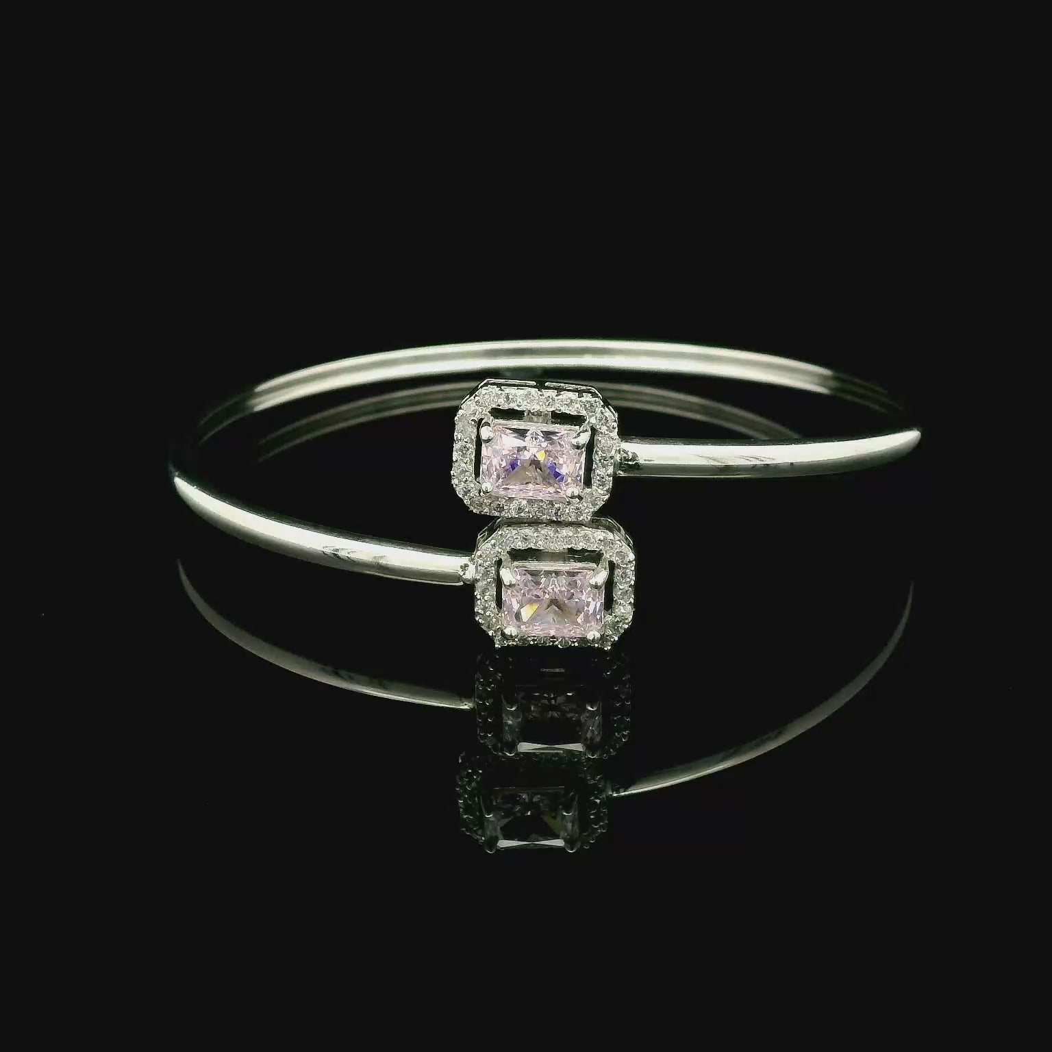 These exquisite open bangles in sterling silver feature radiant center gemstones in sunshine yellow and blush pink, each framed with a delicate halo of sparkling diamonds. The sleek, minimal band contrasts beautifully with the vivid gemstones, adding a touch of vibrancy and sophistication.