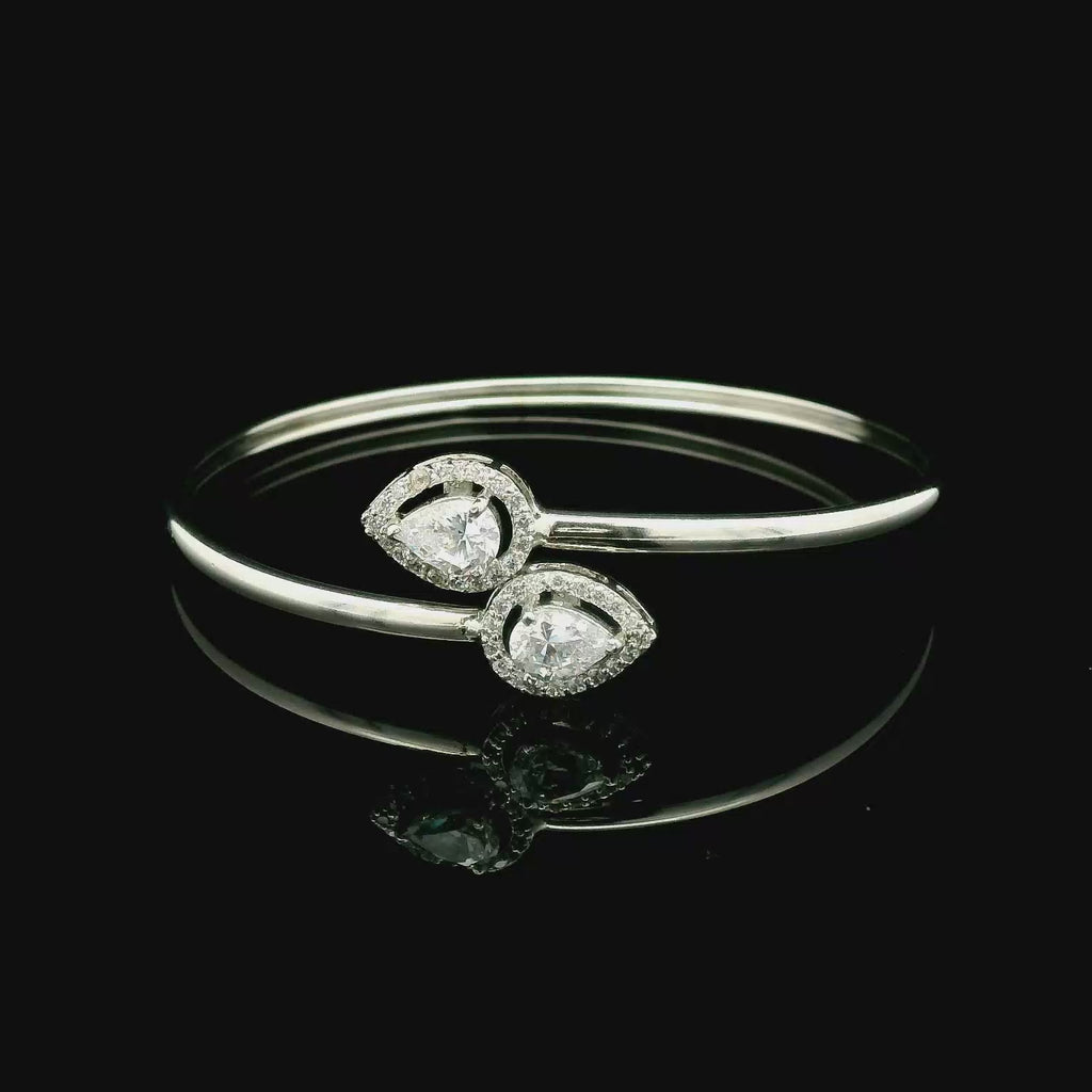 This sterling silver bracelet is a true embodiment of elegance, defined by its twin teardrop design that delicately sits at the center of a sleek silver band. Each teardrop is adorned with a dazzling halo of stones, amplifying the brilliance of the centerpiece and giving the bracelet an aura of radiance.