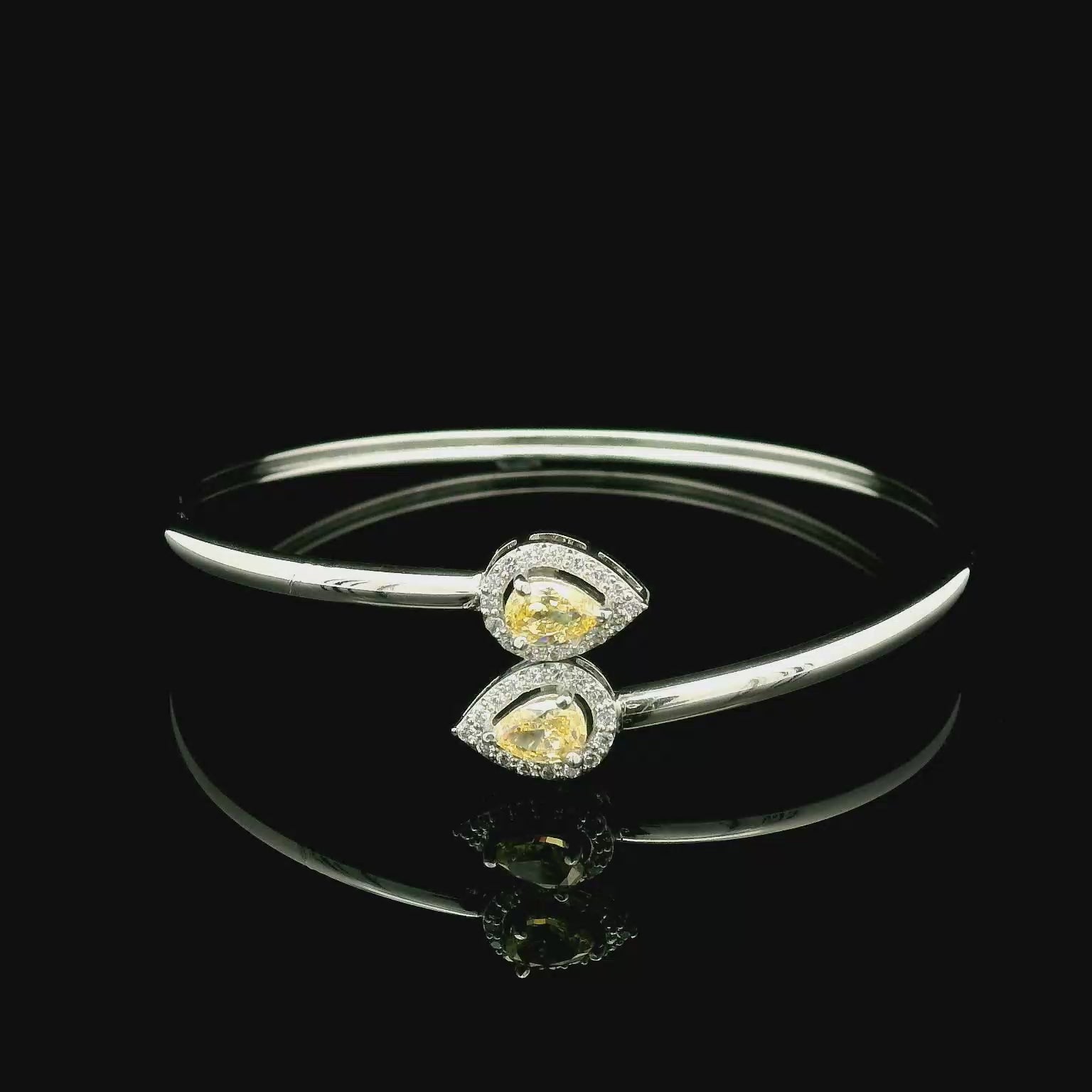 This graceful open bangle in sterling silver features twin pear-shaped yellow gemstones, each framed with a halo of sparkling diamonds. The delicate design combines vibrant color with understated brilliance, creating a piece that is both modern and timeless.
