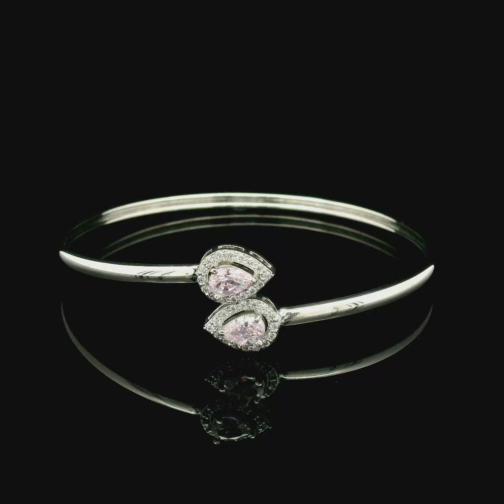 Crafted with precision and artistry, this sterling silver bracelet is a masterpiece that combines elegance with a hint of modern glamour. At its heart lie two captivating teardrop motifs, each adorned with a blush-pink gemstone symbolizing grace, love, and femininity.