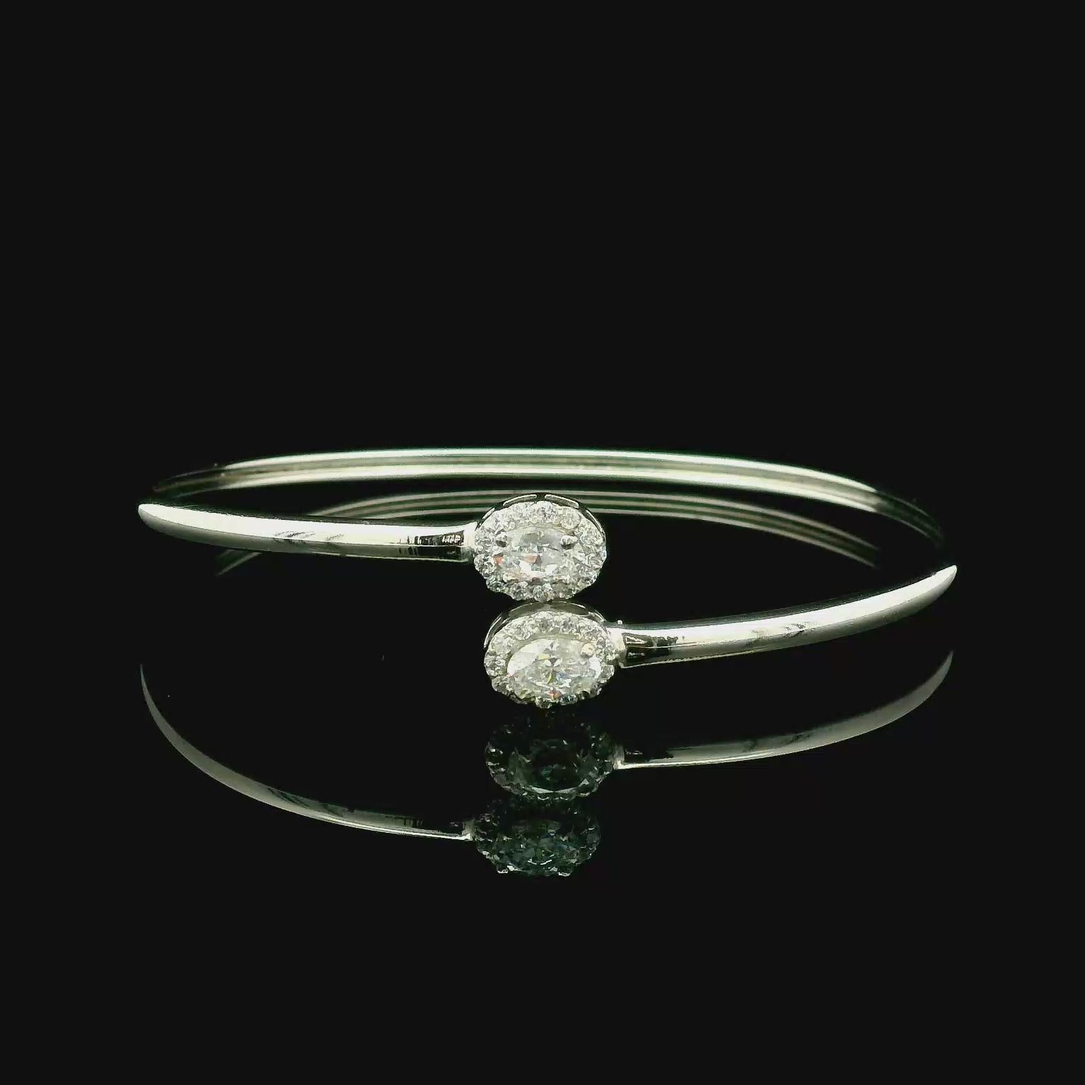 This elegant sterling silver open bangle features twin oval-shaped diamond accents, each encircled by a sparkling halo for enhanced brilliance. The sleek and minimal design creates a refined balance between modern sophistication and timeless charm.