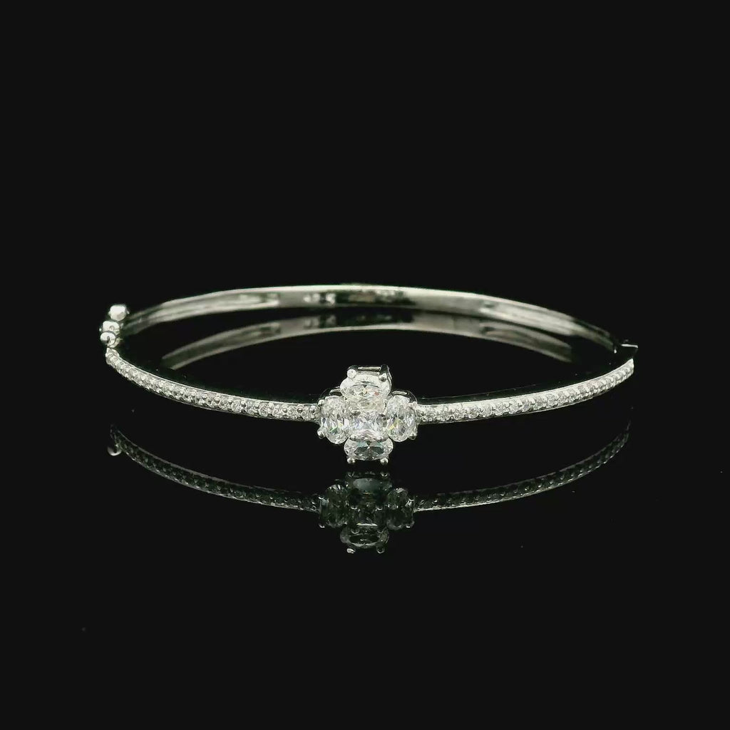 This sterling silver bracelet is a stunning celebration of light and luxury, featuring a radiant cluster of brilliant stones at its center. Designed with a sleek silver band adorned with a line of sparkling accents, it exudes refined elegance and contemporary charm.