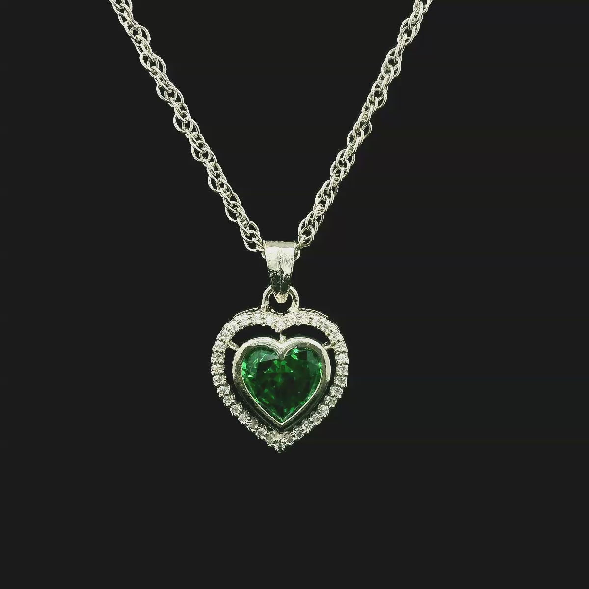 Sterling Silver Green CZ Double Halo Heart Pendant with Chain