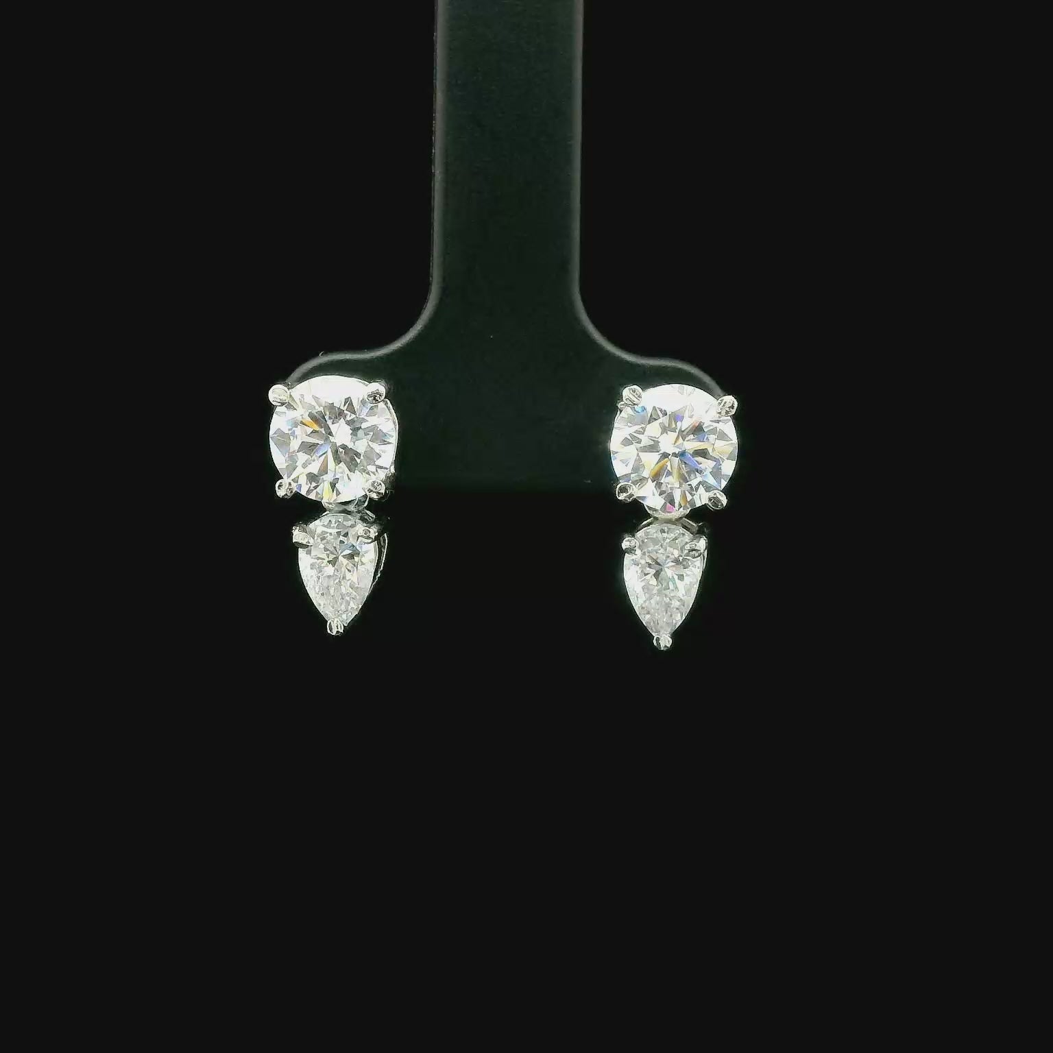 These exquisite stud earrings showcase the timeless allure of two precision-cut white sapphires in a sophisticated drop silhouette. A brilliant round-cut stone crowns each piece, gracefully paired with a pear-cut sapphire beneath, creating a harmonious blend of sparkle and elegance.