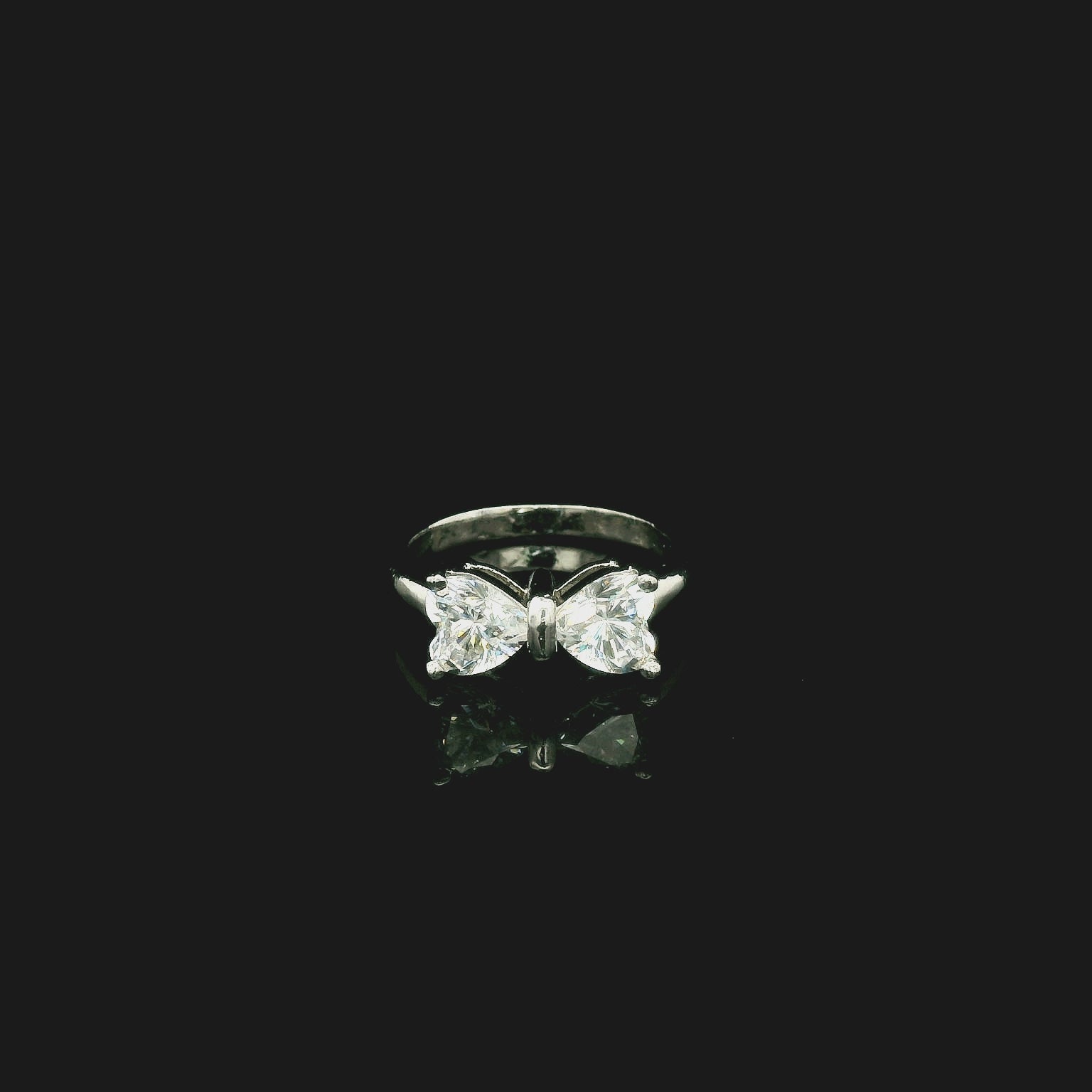 A delicate expression of romance, this sterling silver ring unites two luminous heart-cut stones in a graceful bow-inspired silhouette. The mirrored finish enhances every movement of light, creating a design that feels soft, feminine, and timeless. Crafted as a symbol of affection, it captures the beauty of love in its purest form.