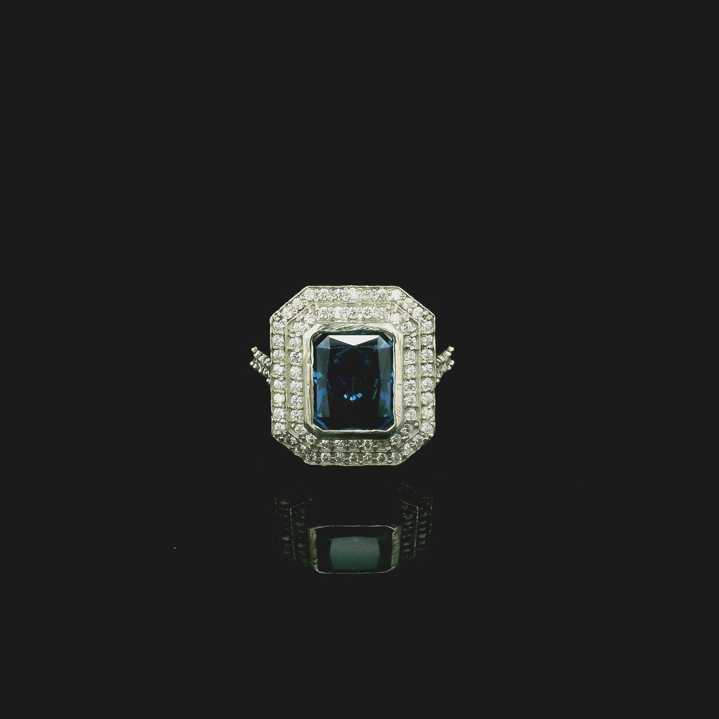 - Stone Setting: Octagon-cut deep blue cubic zirconia with double halo-set clear CZ