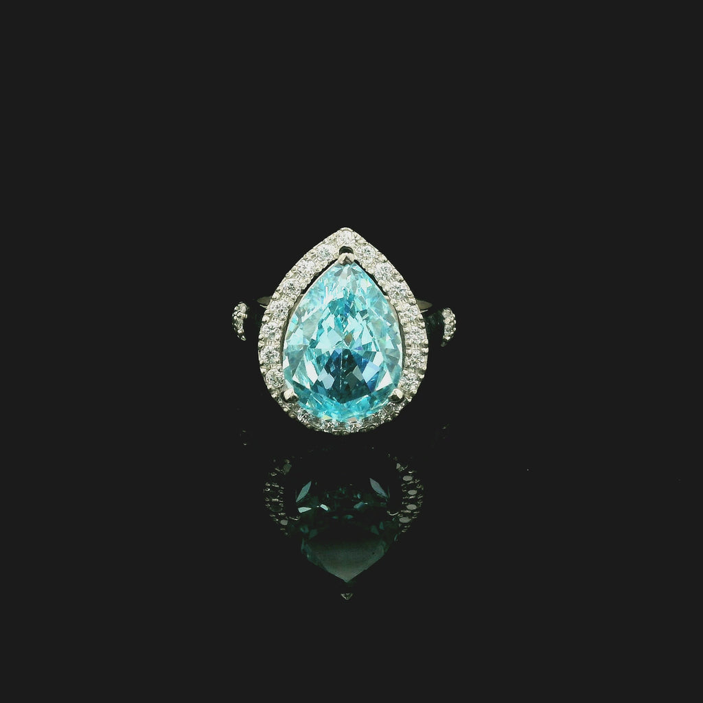 This sterling silver statement ring features a radiant pear-shaped sky blue cubic zirconia centre, surrounded by a sparkling halo of clear stones. The soft blue tone combined with the elegant teardrop silhouette creates a fresh and sophisticated look. Intricate detailing along the band enhances its brilliance, making it a perfect piece for refined everyday elegance or special occasions.