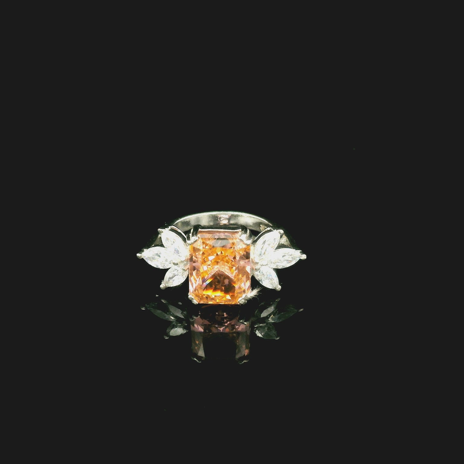 - Centre Stone: Rectangular peach cubic zirconia with radiant brilliance