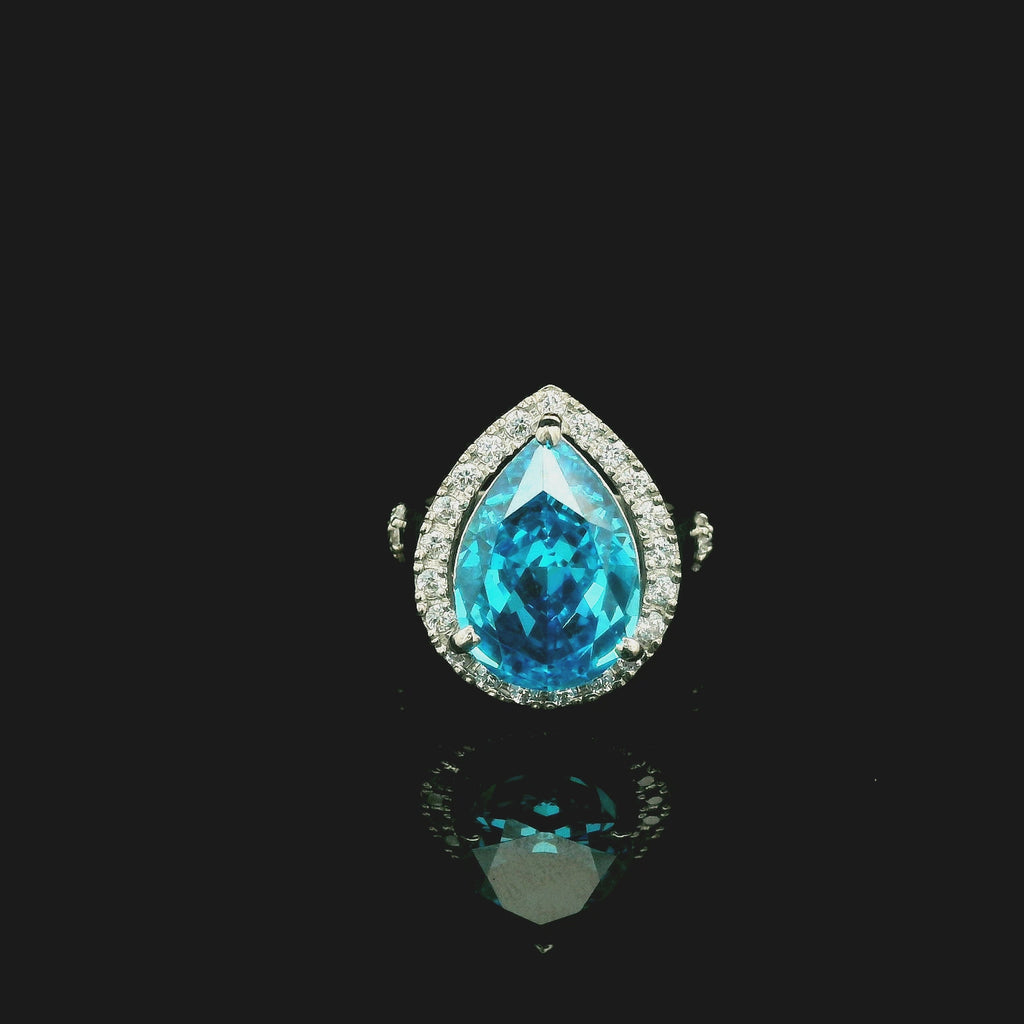 - Stone Setting: Pear-shaped blue cubic zirconia centre with halo-set clear CZ accents