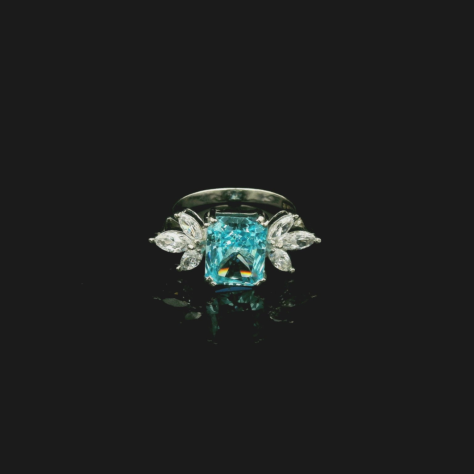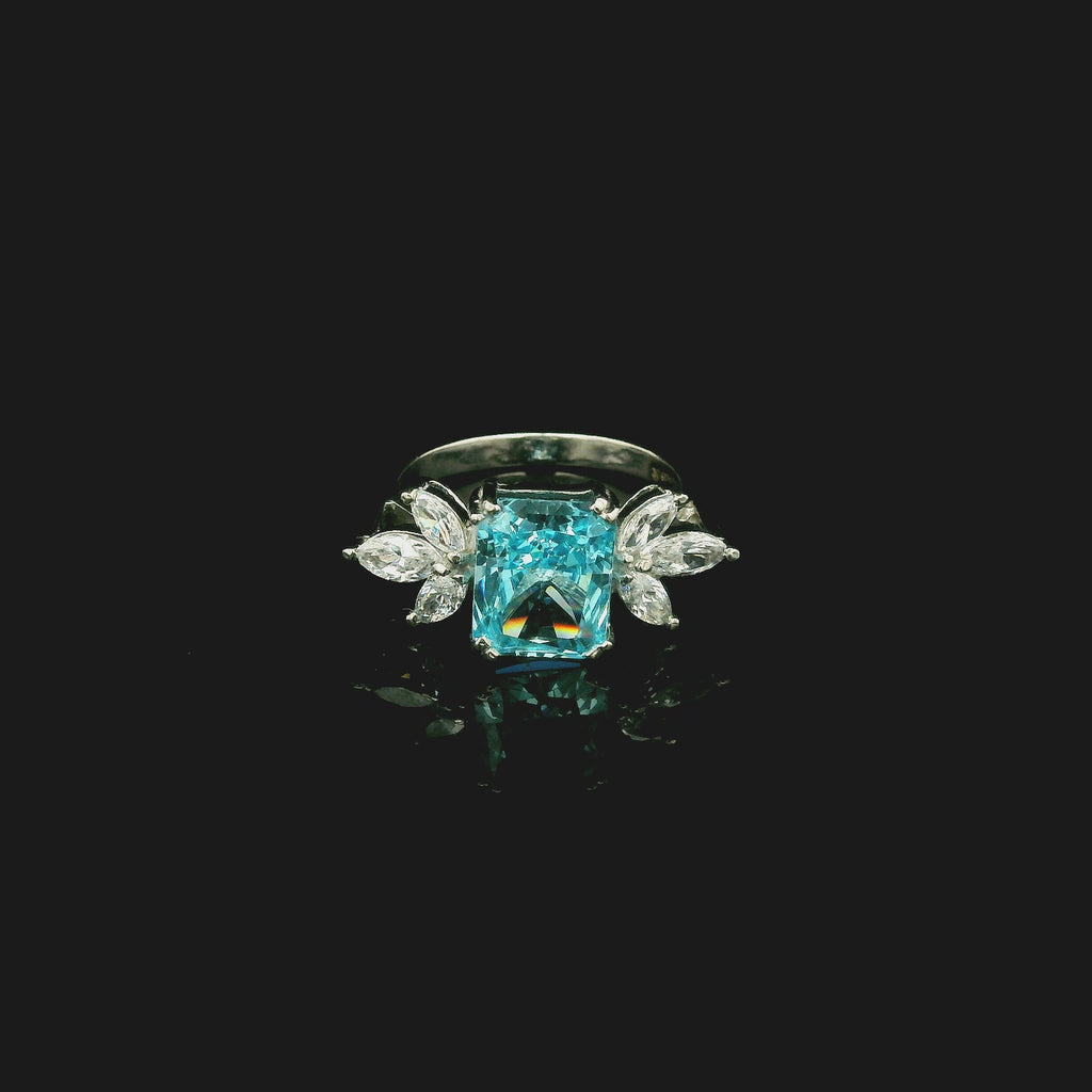 - Centre Stone: Rectangular sky-blue cubic zirconia with radiant sparkle