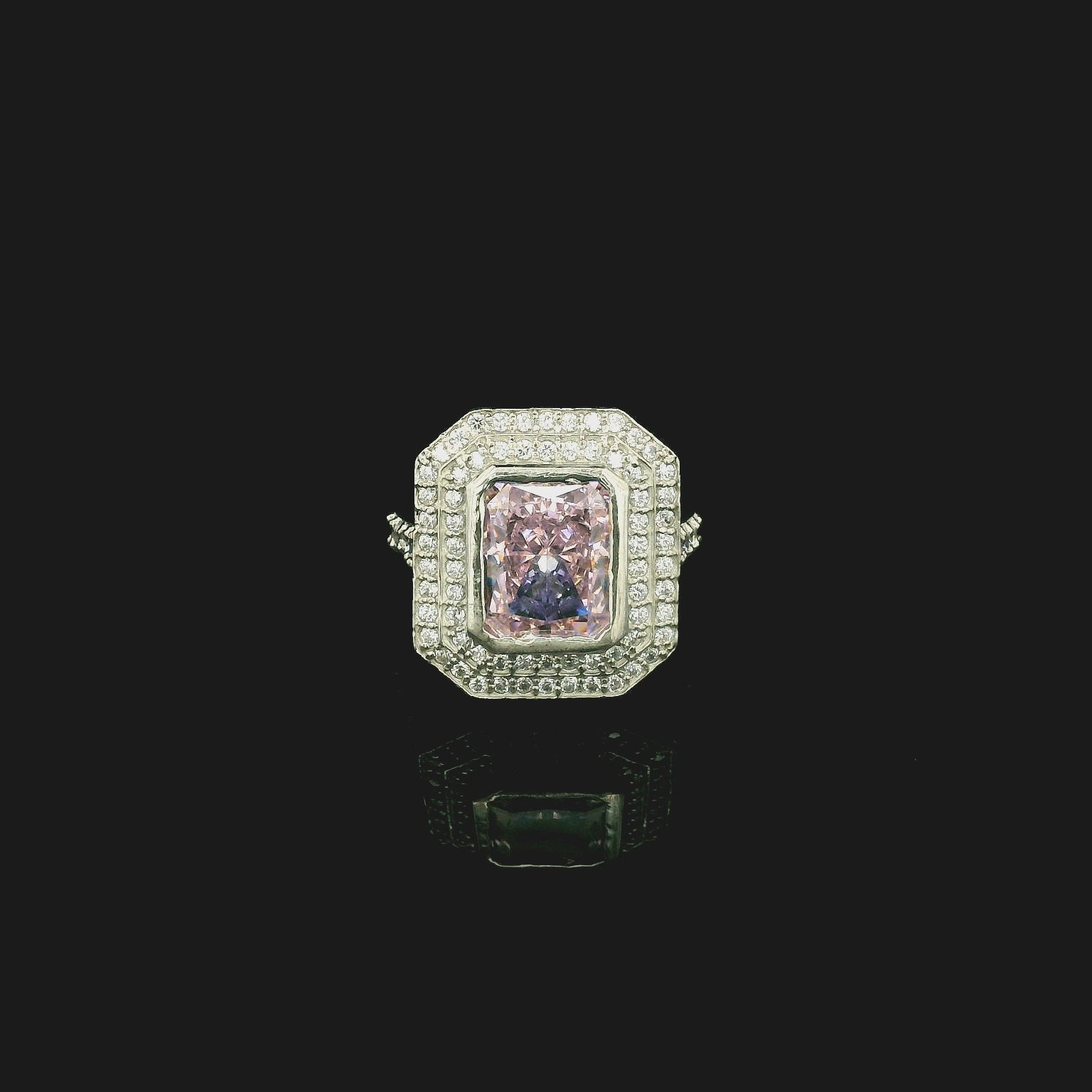 This refined sterling silver ring features a soft pink cubic zirconia centre stone, set within a bold octagonal halo design. Surrounded by shimmering cubic zirconia accents, the layered structure enhances brilliance while adding a delicate feminine charm. A perfect blend of modern geometry and graceful elegance, this ring makes a striking statement for any occasion.