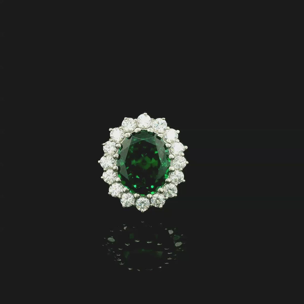 This sterling silver ring features a rich green oval-cut cubic zirconia at the centre, surrounded by a sparkling halo of finely set stones. The elevated prong setting enhances brilliance while adding a bold, elegant presence. Designed to stand out, it brings vibrant sophistication to both everyday wear and special occasions.