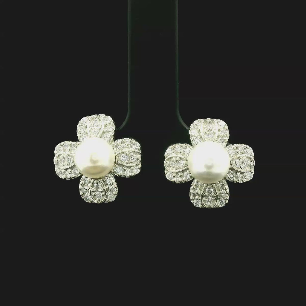 Floral Pearl & Cubic Zirconia Stud Earrings in Sterling Silver