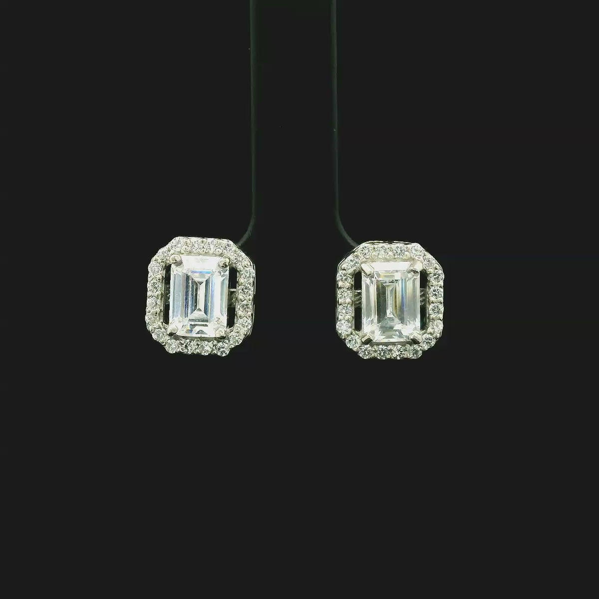 Refined and radiant, these stud earrings feature a striking emerald cut cubic zirconia framed by a delicate halo of sparkling stones. The geometric silhouette enhances clarity and brilliance, offering a sophisticated and timeless appeal. Crafted in polished sterling silver, this design is perfect for elegant everyday wear and special occasions.