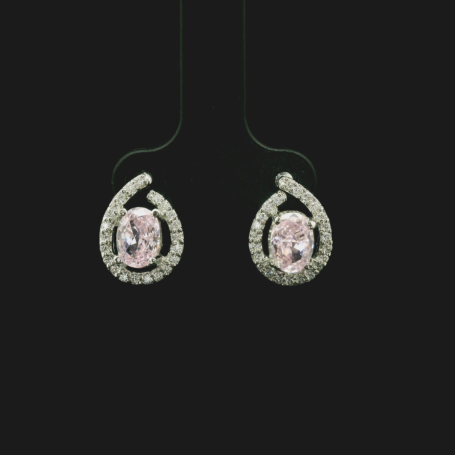 These sterling silver earrings radiate feminine charm with their enchanting pink oval-cut centerpiece surrounded by a shimmering halo of white stones. The elegant swirl design adds a graceful twist, enhancing both sparkle and sophistication.