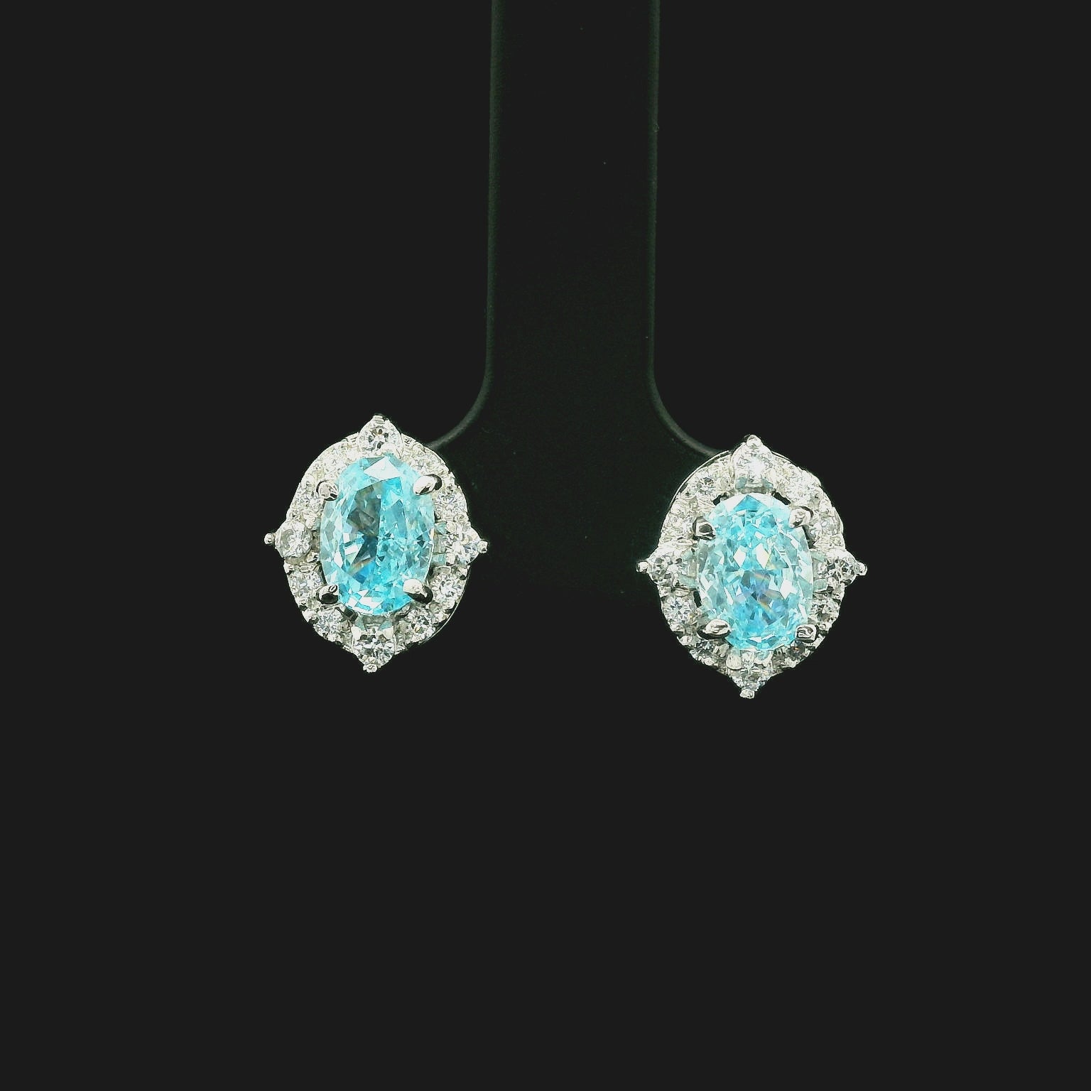 These sterling silver stud earrings captivate with a vivid blue oval-cut gemstone, surrounded by a dazzling halo of sparkling white stones. The elegant design combines freshness and sophistication, making them a standout accessory for day-to-evening style.