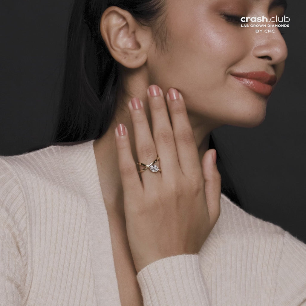 A striking statement of contemporary design, this yellow gold ring features an open crossover band that elegantly wraps around a brilliant oval step-cut lab-grown diamond. The airy silhouette and modern structure create a bold yet refined piece that balances strength with delicate sparkle — a perfect everyday signature or standout accent.