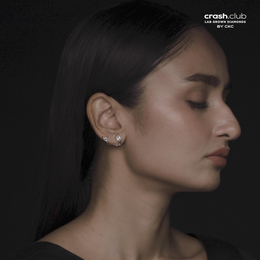 These exquisite white gold ear tops feature flame-cut lab-grown diamonds, curving gracefully along the ear to create a sculptural, modern silhouette. A perfect blend of edgy and elegant, they frame the ear beautifully for a look that’s both sophisticated and fashion-forward.